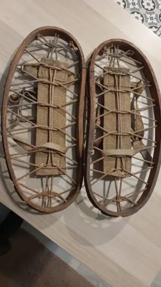 Par de raquetas de nieve antiguas, fabricadas con estructura de madera y cuerdas. - Diseño tradicional. - Correas de tela con hebillas metálicas.
