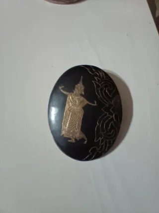 Este broche presenta un diseño de bailarina de Siam con detalles intrincados. - Diseño ovalado. - Figura de bailarina en relieve. - Motivos ornamentales. - Acabado en negro y Plata Muy antiguo del Reino de Siam. Tailandia