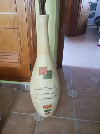Elegante jarrón antiguo con un diseño único y detalles artísticos. - Base ancha y cuello estrecho. - Decoración con motivos geométricos y ondulados. - Tonos tierra y toques de color naranja y verde. Antiguo Jarron de terracota esmaltada pintada a mano. Perfecto estado. 80cm alto, ancho 25cm. Ideal para decorar tanto artistico como rustico
