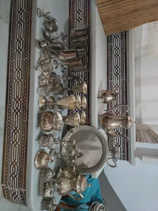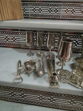 Conjunto de vajilla de latón bañada en plata con un diseño clásico y elegante. - Piezas de plata con detalles ornamentales. - Incluye copas, tazas y bandejas. - Ideal para ocasiones especiales. Se vende todo junto.