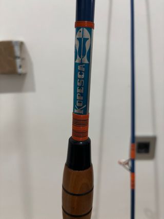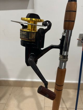 Conjunto de caña y carrete de pesca Daiwa. - Carrete con bobina dorada y detalles negros. - Mango del carrete con empuñadura de madera. - Caña de pescar con mango de madera Caña y carrete antigua escucho ofertas