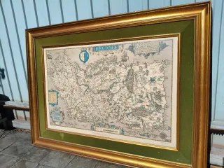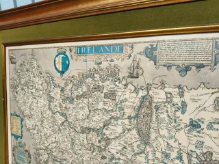 Marco de madera dorado con paspartú verde para un mapa de Irlanda. Medidas 115 cm * 85 cm. - Marco de madera con acabado dorado. - Paspartú de terciopelo verde. - Mapa histórico de Irlanda.