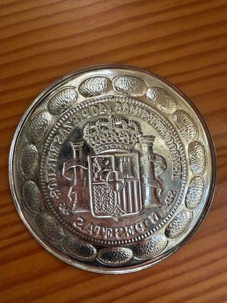 Es un cenicero o pequeño plato decorativo de metal diseñado con la forma de una moneda antigua de 5 pesetas española. Se puede leer "LEY 900 MILESIMAS" y "40 PIEZAS EN KILOG.", que hacían referencia a la pureza de la plata y al peso estándar de las monedas de 5 pesetas. Diseño: Presenta el escudo de armas de España rodeado por una leyenda que indica su composición y valor. Contexto: Este tipo de objetos son piezas de coleccionismo o decoración inspiradas en numismática histórica. 48 gr. NO LEER Antiguedades plata plateado monedas numismatica pesetas