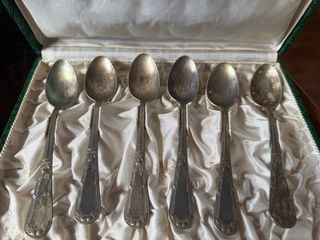 Elegante estuche con seis cucharas de alpaca antiguas, procedentes de Bazar España en Cádiz. Un set con un diseño clásico y detalles ornamentales. - Seis cucharas de alpaca con grabados. - Estuche forrado en tela verde. - Hay que limpiarla