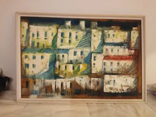 Antigua pintura sobre tela de saco.mide 081x054 ctm - Representación de edificios. - Tonos ocres, azules y blancos.