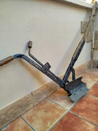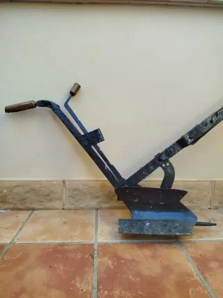 Pieza de labranza antigua, con un diseño robusto y tradicional. - Estructura de metal negro. - Mangos de madera. - Arado de vertedera.