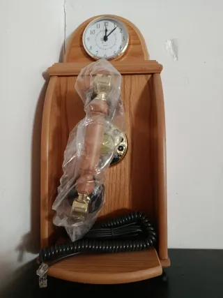 Teléfono fijo de estilo antiguo, con un diseño de madera y detalles dorados. Incorpora un reloj en la parte superior. - Diseño de madera. - Detalles dorados. - Reloj integrado. -Sin uso