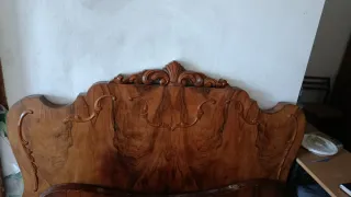 Conjunto de cabecero antiguo y dos mesitas de noche a juego. Piezas con un diseño clásico y elegante. - Cabecero de madera con detalles tallados. - Dos mesitas de noche a juego.