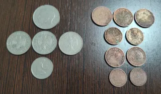 39 monedas Francia: 5 F 1946 (ligera), 1963, 1973, 1974; 1 F 1944, 1947, 1949 B (aluminio, 2 con marcas), 1960×5 (1 algo desgastada), 1961, 1972×2, 1974 (lig. gastada), 1977×2; medio F 1965, 1967, 1984; 5 cént 1961×2, 1966 (cobriza, más gastada); 50 cént 1962; 20 cént 1967, 1975, 1983; 10 cént 1963, 1973, 1976×3, 1977 (1 con golpe); 20 F 1950; 10 F 1950 B, 1951, 1952, 1953 B. Brillantes en general; algunas cobrizas y aluminio con marcas típicas. No han recibido tratamiento químico alguno. Contacto directo: 615570298 No dude en pedir más fotos y/o video si lo requiere