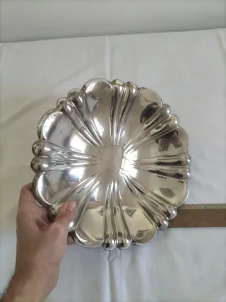 Vajilla antigua plata plateado alpaca fuente servir bandeja vintage Alpadur. Es una fuente de servir, centro de mesa, frutero, para poner apertura o un guiso. Es una pieza de alpaca, sellada en la trasera de la marca Alpadur (Alpaca Pedro Durán) una pieza de hechura y calidad con marcas del uso (ver fotos) de los típicos arañazos con los cubiertos de servir. Se puede limpiar muchísimo más, pero es muy bonita y aparente y grande de 29cm de diámetro por 3,5 cm de alto. En mi perfil tengo otros objetos para mesas especiales, ver, gracias.
