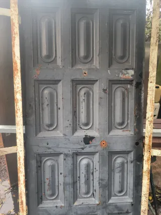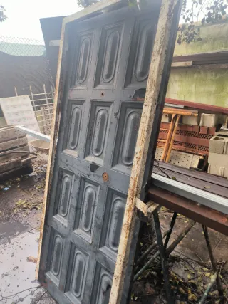 Puerta antigua de madera con su premarco metálico. Presenta un diseño clásico con paneles. - Puerta de madera. - Marco metálico. - Diseño de paneles.