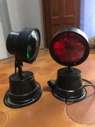 Dos luces rotativas antiguas, ideales para crear ambiente. Una es de color rojo y la otra verde, son de metal y se pueden ajustar con los tornillos, cuanto mas lejos la pongas mas grande es el circulo que proyecta