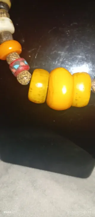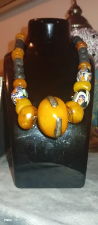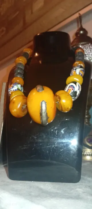 Collar de estilo antiguo procedente de África, con una combinación de cuentas de diversos materiales y colores. - Diseño tribal. - Cuentas de , piedra y otros elementos. - Tonos naranjas y multicolores.