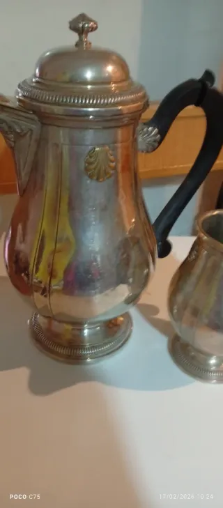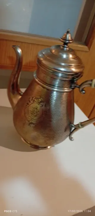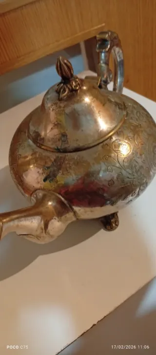 Tetera antigua con detalles plateados y dorados. Su peso indica que es un objeto de calidad. - Diseño clásico. - Materiales de metal.