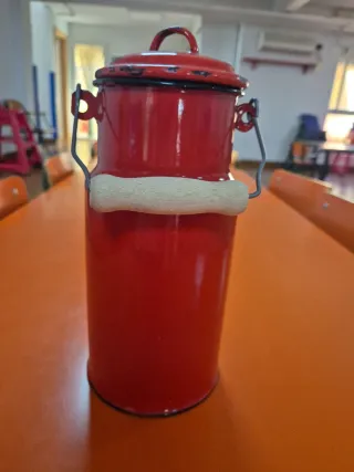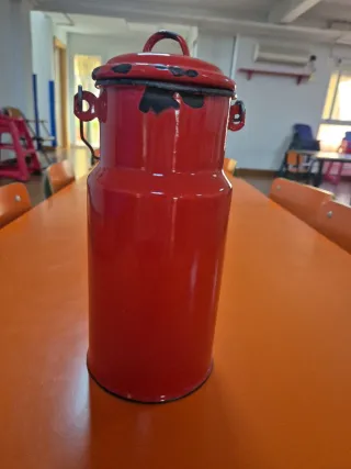 Lechera antigua de color rojo, con un diseño clásico y un asa en la tapa. - Material: esmalte. - Color: rojo.
