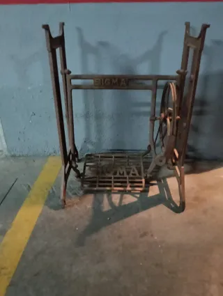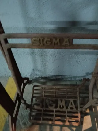 Base metálica antigua para máquina de coser, con la marca SIGMA. - Estructura de metal resistente. - Diseño clásico y robusto.