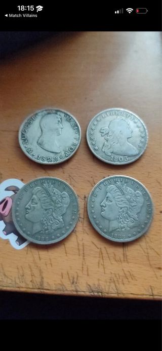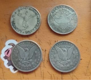 Conjunto de monedas de plata con diseños clásicos. - Una moneda con un águila en el reverso y ONE DOLLAR en la parte inferior. - Otra moneda con un águila y STATES OF AMERICA alrededor. - Una moneda con un águila y In God we trust en la parte superior. - Una moneda con un ave en el centro y CONSTITUTION en la parte inferior.
