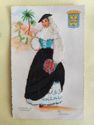 Antigua postal de La Palma, Canarias, con un bordado detallado de una mujer con traje tradicional. - Bordado artesanal. - Representación de paisaje canario. - Escudo de La Palma.