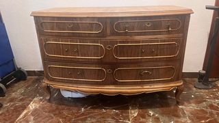 SOLO RECOGIDA Elegante cómoda antigua con un diseño clásico y acabados detallados. - Fabricada en madera. - Tiradores y detalles ornamentales dorados. Faltan algunos. - Patas curvas con un estilo refinado.