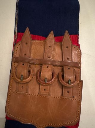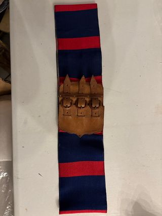 Cinturón de tela con un diseño de rayas azules y rojas, y un detalle central de cuero. - Diseño de rayas. - Detalle central de cuero con hebillas.
