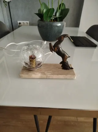Preciosa lámpara de mesa antigua con un diseño único, época art deco, años 30-40. -Portalamparas y bombilla original de bayoneta, incluye bombilla, se consiguen en internet, también se puede cambiar por un portalámparas para bombilla más común en España. - Base de mármol. - Figura de cabra en metal. - Pantalla de cristal craquelado. -Medidas aproximadas