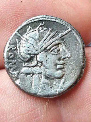 Moneda antigua de plata de la época romana.Denario romano republicano de plata de Fannia año 123 ac Roma autentico envios combinados - Diseño detallado de un perfil. - Material: Plata.