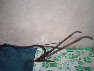 Arado tradicional para labrar la tierra. - Estructura principal de madera. - Pieza de arado de metal. - Mangos curvos para sujeción.
