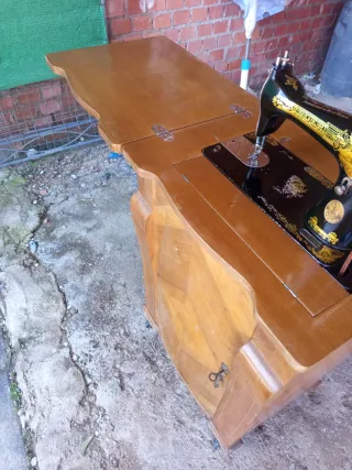 Preciosa máquina de coser Singer con detalles dorados y base de madera.( Dispongo de furgoneta para llevarla donde sea ) - Diseño clásico y elegante. - Mecanismo de metal. - Mueble de madera con compartimento.