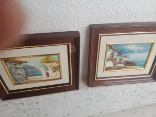 Conjunto de dos pequeños cuadros antiguos pintados al óleo. Representan escenas marinas con casas y barcos. - Pintura al óleo. - Marcos de madera.