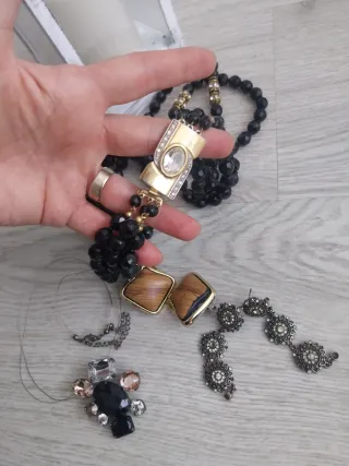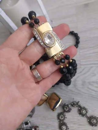 Conjunto de bisutería antigua con varios estilos. Buen estado por los años que tienen - Collar largo con cuentas negras y detalle dorado con pedrería.pesa mucho - Pendientes largos con motivos florales y pedrería. - Collar con colgante grande de piedras negras y transparentes. -pendientes cuadradas con acabado de madera y borde dorado.