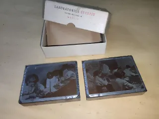 Conjunto de clisés antiguos encargados por los Laboratorios Everfit para trabajos de publicidad( catálogos o albaranes) - Incluye dos clisés con imágenes de los trabajadores en los laboratorios. - Caja original de los laboratorios. Años 40.