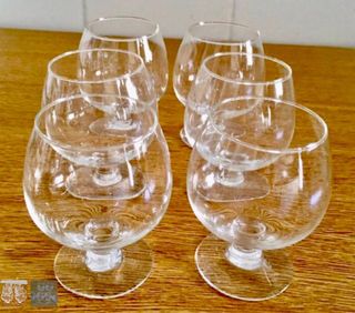 Conjunto de seis copas de coñac antiguas. - Diseño clásico y elegante. - Base estable para un buen apoyo. - Perfectas para degustar licores. - Miden 9 cm de alto x 5,6 de diámetro.