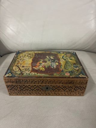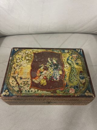 Preciosa caja de madera de estilo japonés, con un diseño intrincado y detalles pintados a mano. - Decoración con escena oriental y aves exóticas. - Cerradura metálica central. - Bordes con patrón geométrico.