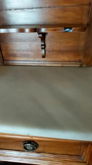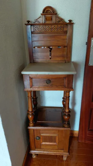 Mesita de dormitorio alta antigua. Estilo alfonsino s. XIX. Original de la epoca. Es de madera noble, probablemente nogal. Medidas: 41 cm alto primera bandeja, 80 cm alto superficie, 120 cm alto total, 42 cm largo, 37 cm ancho o fondo. Combina la calidez de la madera con la frescura del mármol. No se envia. Entrega en mano. - Encimera de mármol. - Estructura de madera tallada. - Cajón con tirador. - Compartimento inferior con puerta.
