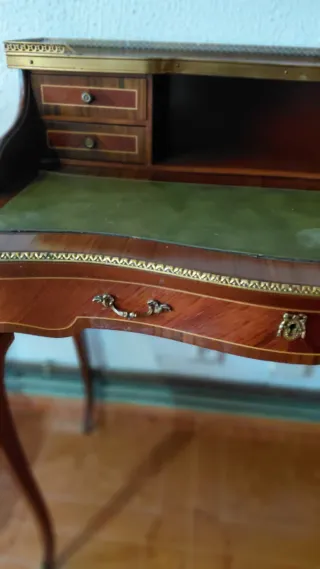 Elegante escritorio de estilo Luis XV, con un diseño refinado y detalles ornamentales. Se entrega en persona - Encimera con acabado en piel verde. - Patas curvas con detalles metálicos. - Cajones con tiradores decorativos.