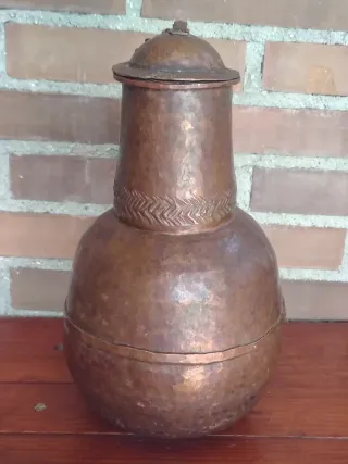 Antiguo cántaro de cobre con asa y tapa con cadena. Auténtico Cántaro para agua tradicional de cobre con acabado martillado y aspecto rústico. Medidas: 32 cm de alto, 20 cm de ancho. Muy bien conservado.