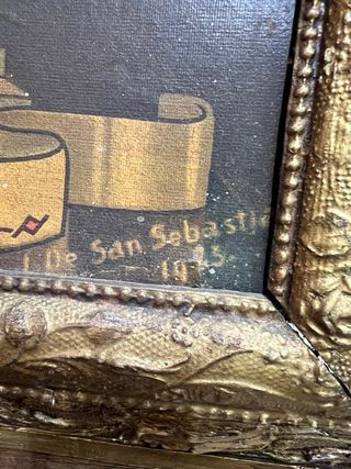 Precioso cuadro antiguo con un bonito bodegón. Se encuentra en buen estado, aunque presenta algunas señales de uso en el marco. - Pintura de estilo clásico. - Representación de un bodegón con frutas y un instrumento musical. - Marco de madera de color beige claro.