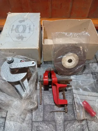 NO ENVÍO..Solo TRATO en MANO.. Antiguo AFILADOR Manual marca ALCIÓN. Sin estrenar, en su ENVASE original y Antiguo y Pequeño TORNILLO de BANCO de la Marca SUPER -MAZA, NODULAR.....NO NEGOCIO EL PRECIO,No Aparto ni Separo piezas ,precio del CONJUNTO..ideal coleccionistas o aficionados al bricolaje.