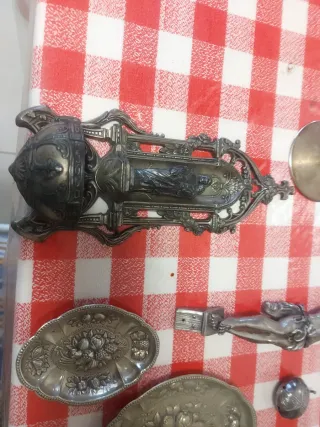 Conjunto de piezas antiguas de colección. - - Copa de metal. - Platos decorativos de metal. - - Encendedores antiguos. - Figura decorativa de metal. El teléfono es de onix tiene una patilla rota se ven en las fotos. La benditera de la última foto es francesa No contesto si vendería solo una pieza o dos. Se vende el lote entero.NO ES PLATA. Último precio. 50€