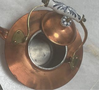 Tetera grande antigua de cobre con sello en base.El asa es de ceramica con detalles en azul. Tiene signos evidentes de paso del tiempo