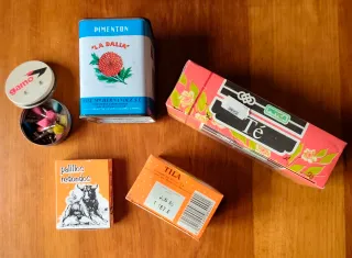 Conjunto de artículos de colección. - Lata metálica La Dalia de Extremadura. - Envase redondo Gamo con contenido. - Caja de té Pryca con 25 bolsitas. - Caja de Sueños de Oro Tila con 10 bolsitas. - Estuche de palillos higiénicos