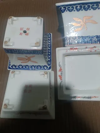 Conjunto de antigüedades decorativas. - Dos jarrones blancos con detalles en azul y dorado. - Dos bases cuadradas con motivos florales en tonos rojos y naranjas.