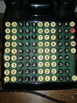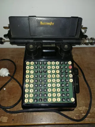 Sumadora mecánica marca Burroughs, un clásico de la contabilidad. - Diseño vintage. - Teclado numérico completo hasta 100M.. - Incluye teclas de función como TOTAL y NO SUMA. Con enchufe americano