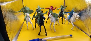 Juguetes clásicos de plástico, ideales para coleccionistas. Las piezas presentan un colorido llamativo y están en buen estado para su edad. - Figuras de plástico. - Temática del oeste americano. -Comobse ve en fotos,una está partida,un caballo un pata. Son un total de 23 caballos y figuras.