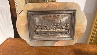 Conjunto de dos placas decorativas de arte sacro vintage. Cada placa presenta una figura religiosa en esmalte sobre metal, montada sobre una base de madera maciza. Tamaño: 235×110×40 mm. Peso total de las 2 figuras: 1.080 gramos. Piezas vintage (años 50-70 aprox.), de estilo claramente relacionado con los talleres de arte religioso de Olot. Trabajo artesanal, colores vivos y muy decorativas. - Diseño religioso con detalles en esmalte. - Base de madera maciza oscura. - Piezas únicas para coleccionistas. - Se venden juntas. Precio del lote completo