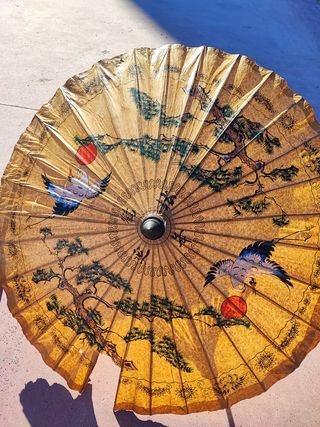 w55/60. Sombrilla papel antigua oriental, china. Parasol. Paraguas. Desperfecto, se puede pegar, ver foto