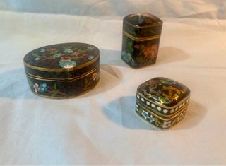 Antiguo juego de cajas Chinas bronce esmaltado Cloisonne , una de ellas con sello , la mas pequeña tiene la bisagra mal . precio por el lote completo , si se quieren por unidad subira el precio . Podibilidad de entrega en mano en Almeria , Malaga , Jaen y Granada .