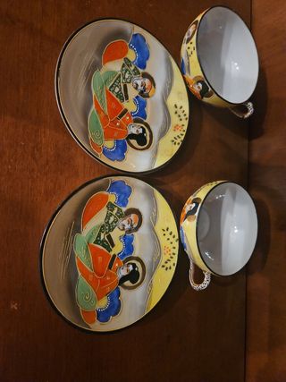 Precioso juego de dos tazas de café con sus platillos. De porcelana fina, con delicados dibujos de estilo chino antiguo. Las piezas presentan un diseño colorido y están en buen estado. - Dos tazas y dos platillos. - Porcelana fina. - Decoración estilo chino antiguo.