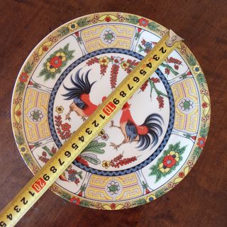 Plato decorativo, chino, motivo lucha de gallos, vintage, retro, plato para la pared, plato para colgar, años 60. 20 cm de diámetro - Motivo central con dos gallos. - Borde decorado con motivos florales y grecas.