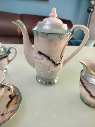 Elegante juego de café de porcelana china con un diseño de dragón. - Incluye tetera, azucarero, 6 tazas con sus 6 platos y lechera. - Acabado nacarado con detalles en verde y negro. - Diseño oriental con motivos de dragón. - Perfecto estado - En la última foto se aprecia la marca de autenticidad, se ve la china al trasluz al fondo de las tazas.